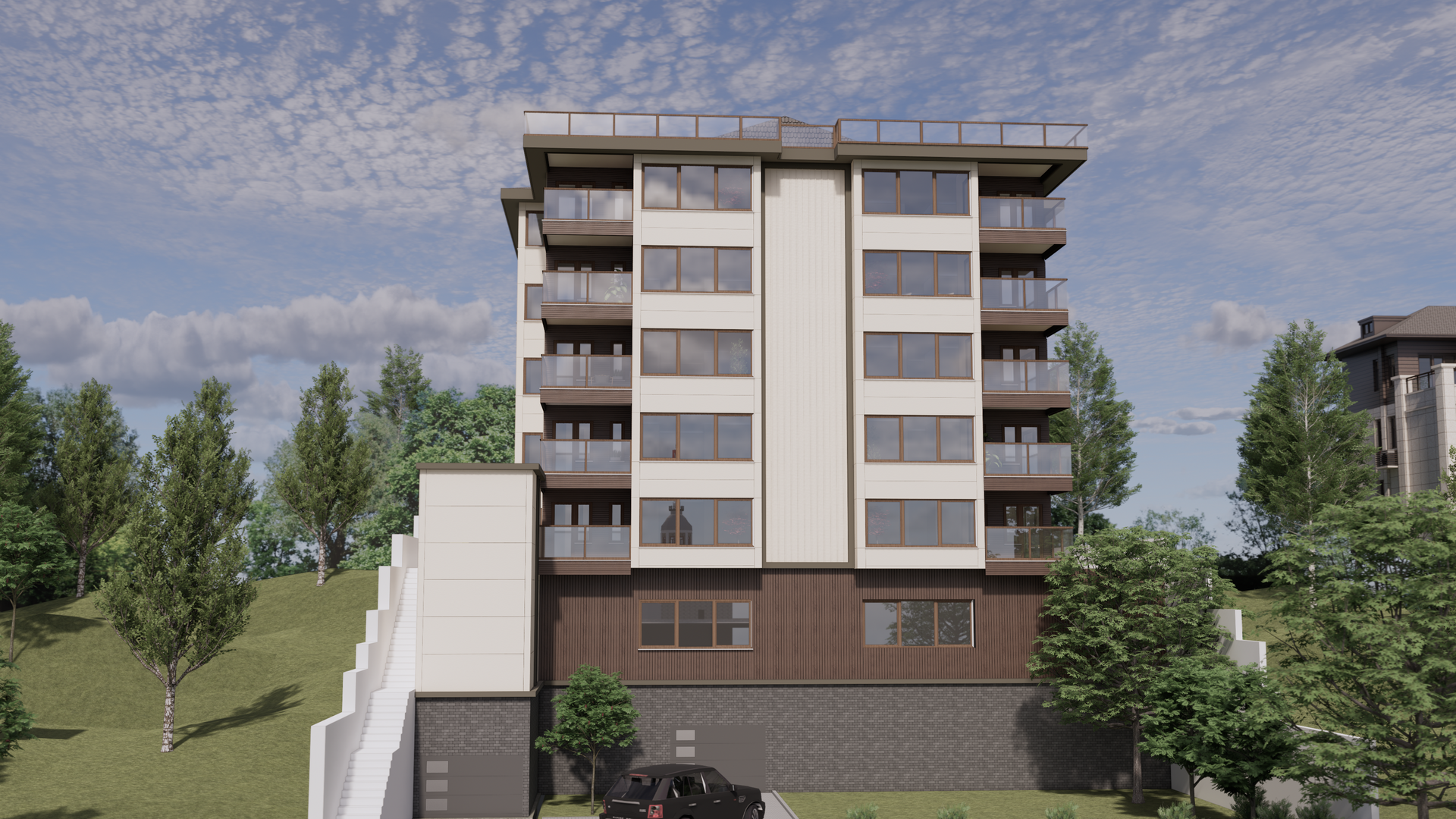 Cephe tasarımı, projenin en kritik ve hassas bileşenini oluşturdu. Binanın konumu, onu sadece bir yapı değil, aynı zamanda İstanbul’un en çok fotoğraflanan ve tarihi açıdan en zengin manzaralarından birinin kalıcı bir parçası haline getiriyor. Bu büyük sorumlulukla, mevcut yapının mimari karakterine saygılı, ancak onu günümüzün modern tasarım çizgisine taşıyan bir yaklaşım benimsedik. Cephede, Boğaz’ın dinamik ve değişken dokusuyla rekabet eden iddialı formlar veya karmaşık detaylar yerine, ona sakin bir fon oluşturan, asil ve net bir duruş hedeflendi. Malzeme geçişlerinde yaratılan ritim ve uyum, yapının kütlesini hafifletirken, seçilen renk paleti ve dokular hem denizle olan görsel ilişkiyi güçlendirmek hem de zamanın estetik etkilerine karşı koyacak kalıcı bir değer sunmak üzere kurgulandı.